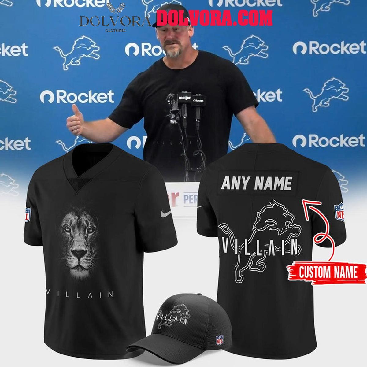 Featuring a sleek all-black design, this Detroit Lions Villain football jersey delivers a dark, intimidating aesthetic. The powerful lion graphic on the front represents strength and dominance, while clean typography and minimalist detailing give it a modern, street-inspired edge. The back highlights the Villain theme with custom name personalization, making the jersey both personal and unmistakably bold.