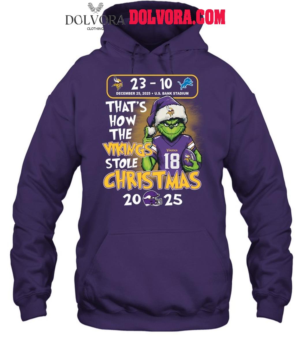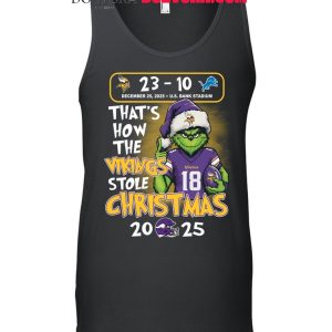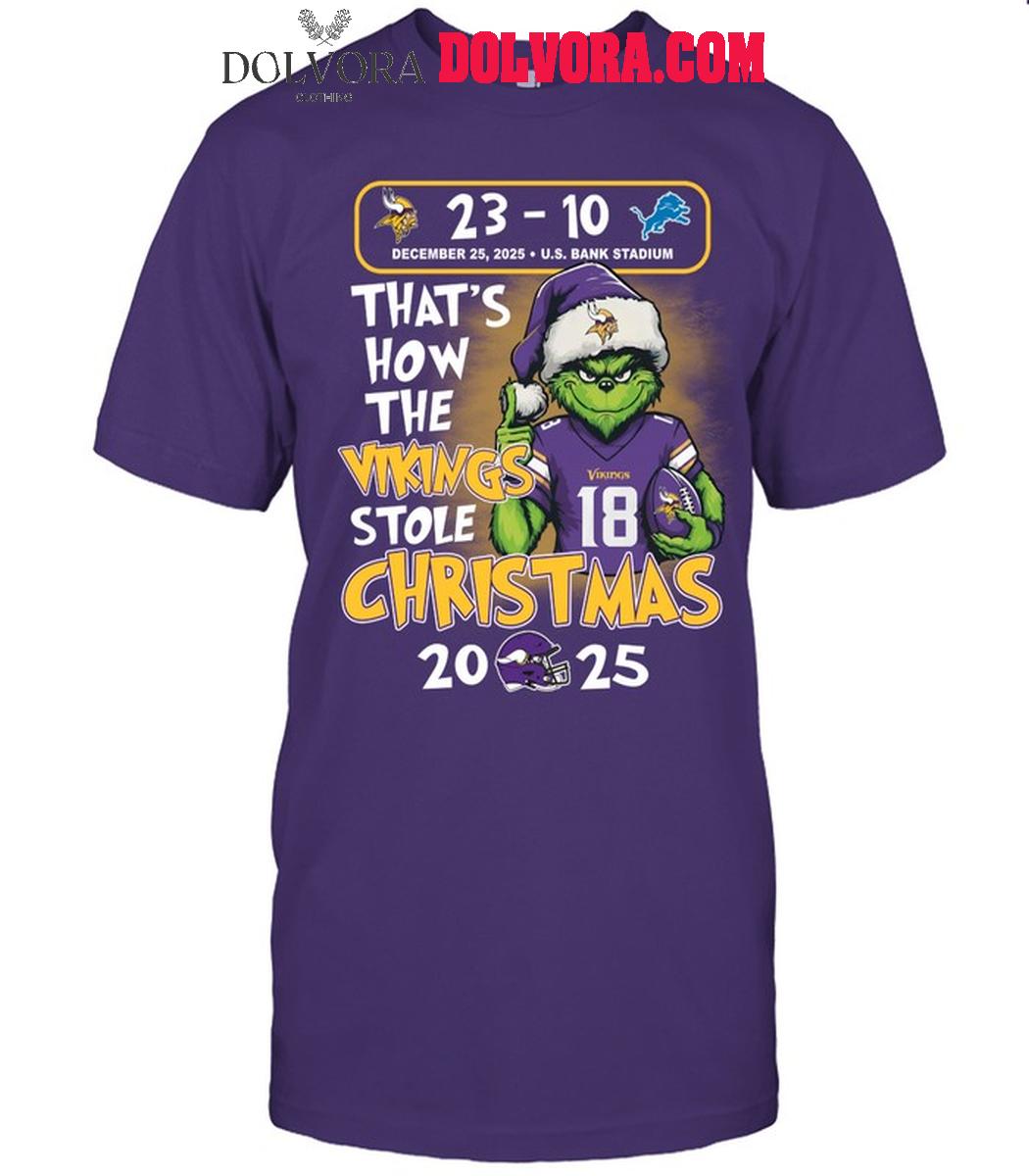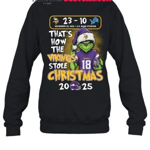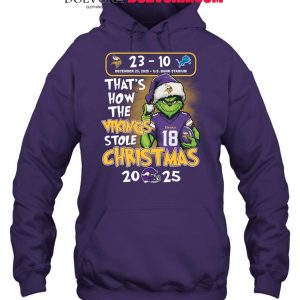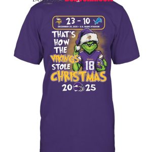 Featuring a playful Grinch-inspired design dressed in Vikings colors, this shirt highlights the iconic slogan “That’s How We Stole Christmas” along with the memorable 23-10 scoreline, symbolizing a proud Vikings victory. The vibrant purple background, bold typography, and detailed illustration create a fun yet powerful statement that every true Vikings fan will appreciate.