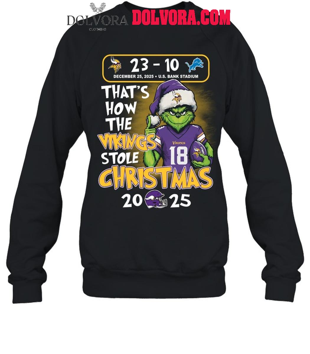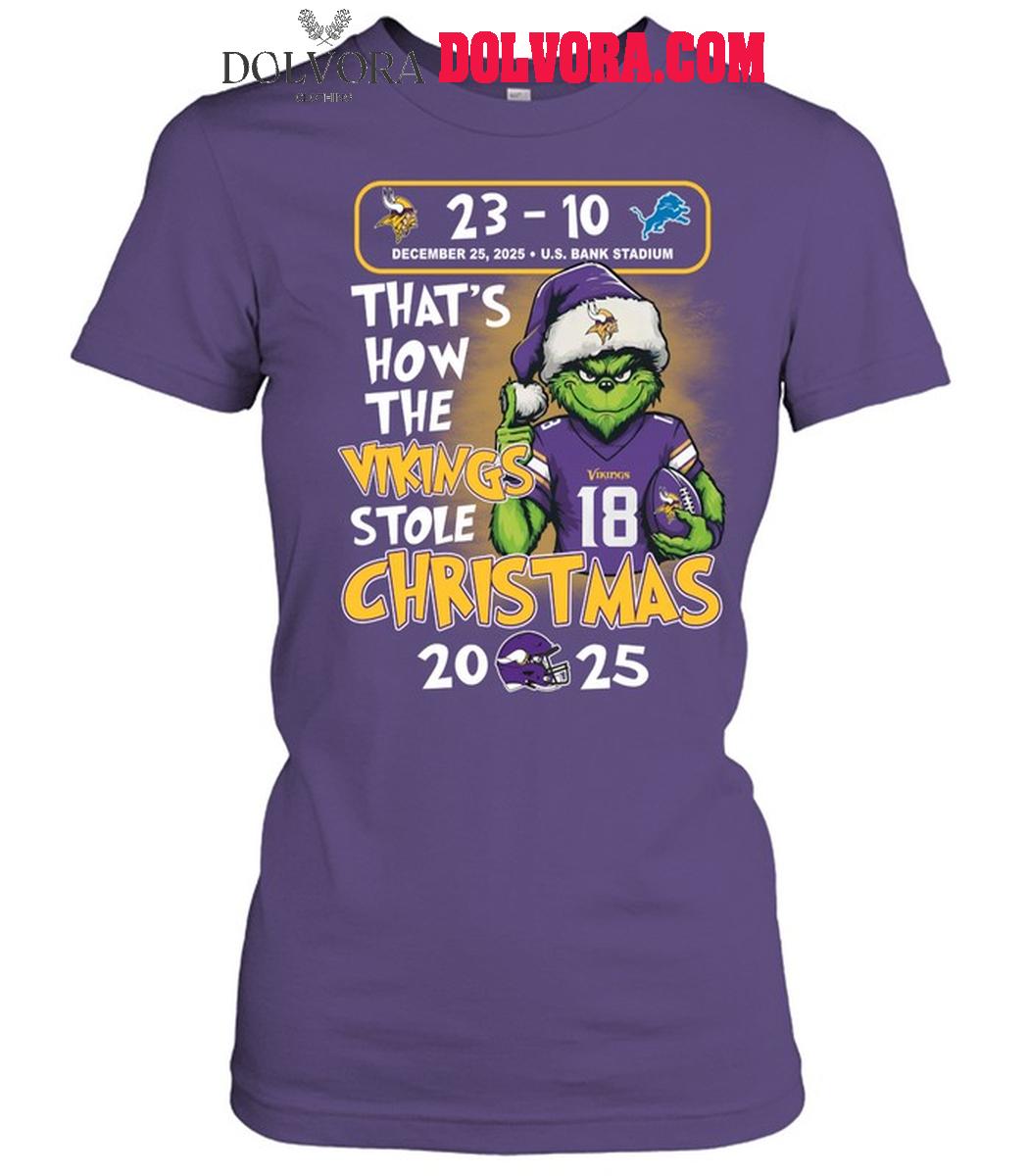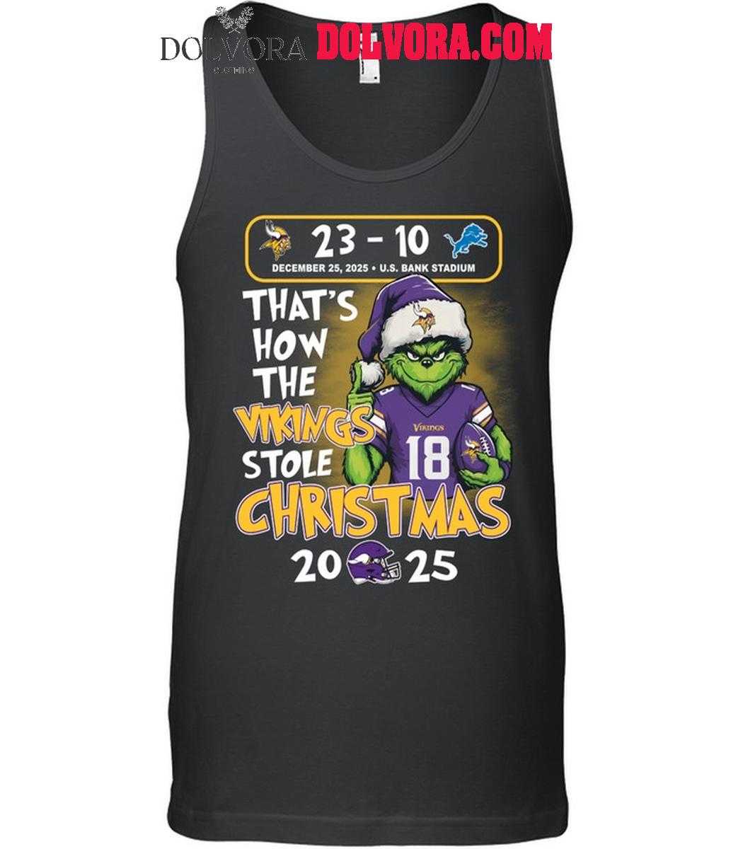 Featuring a playful Grinch-inspired design dressed in Vikings colors, this shirt highlights the iconic slogan “That’s How We Stole Christmas” along with the memorable 23-10 scoreline, symbolizing a proud Vikings victory. The vibrant purple background, bold typography, and detailed illustration create a fun yet powerful statement that every true Vikings fan will appreciate.