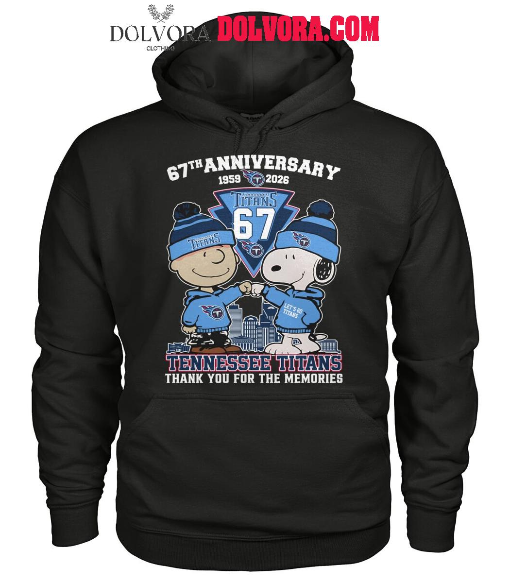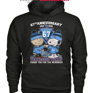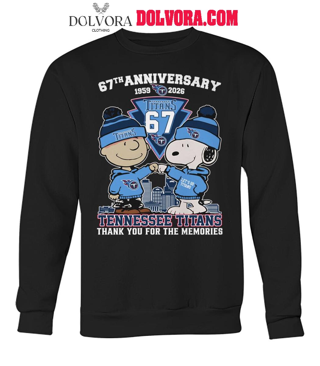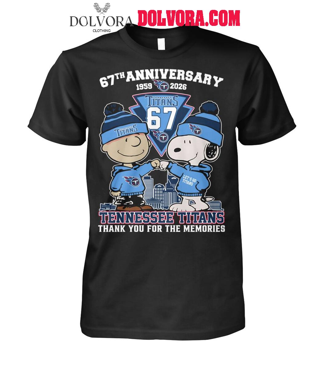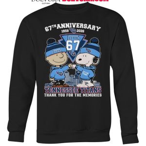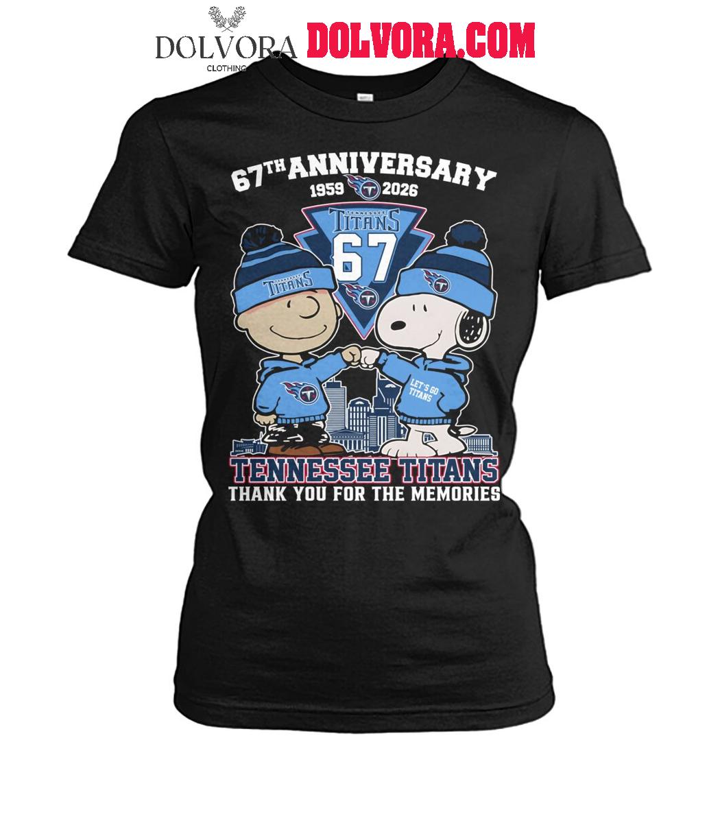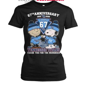 The front graphic highlights “1959–2026 | 67 Years”, honoring the franchise’s long journey, paired with iconic Peanuts characters styled in Titans-themed gear. The heartfelt message “Thank You For 67 Years Of Memories” captures the emotional connection between the team and its fans, making this shirt more than just apparel—it’s a symbol of tradition and appreciation.